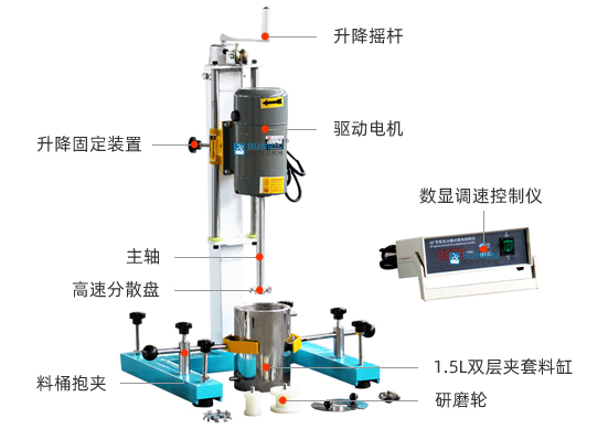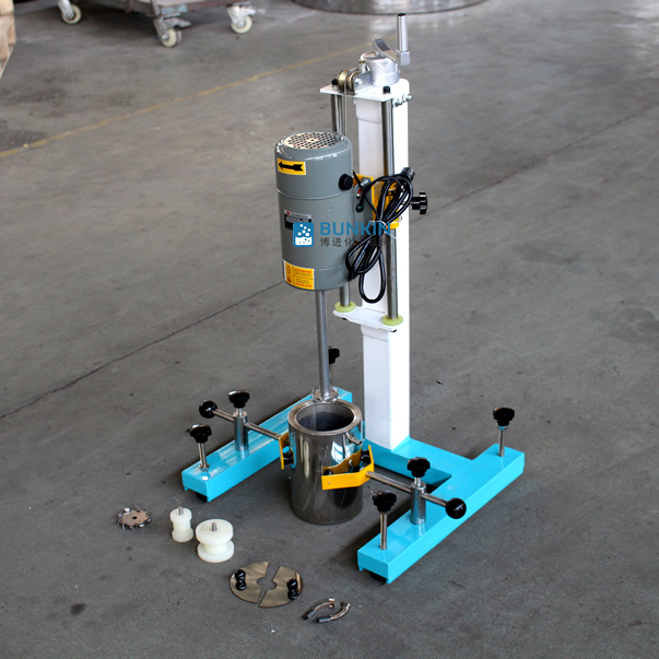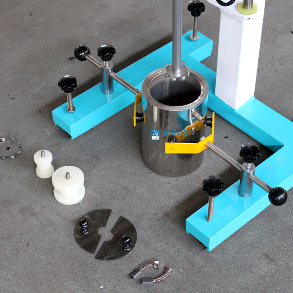 設(shè)備帶有鎖緊及升降手柄,能夠快速升降和固定;分散盤采用內(nèi)六角螺栓與主軸固定,能夠方便快速拆卸更換,清洗容易;帶有夾桶裝置,可以快速將攪拌桶固定,防止桶在工作中發(fā)生位移造成安全事故。