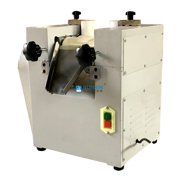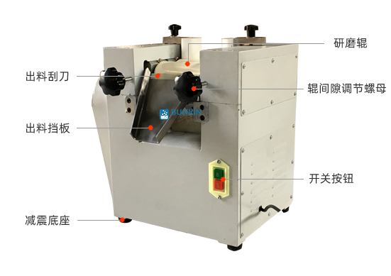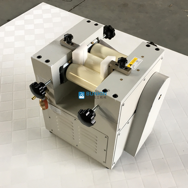 實驗室三輥研磨機由三個輥筒組成,裝在一個機架上,由電動機直接帶動。一般輥筒間的轉動方向不同,前輥向前轉動,中輥向后轉動。輥子轉速前輥快、后輥慢。中間輥固定,前后兩輥裝在滑道上,有彈簧裝置,用手輪調節(jié)前后輥與中輥的距離。物料由后輥與中輥之間進入,受到輥筒的擠壓,產(chǎn)品顆粒變細,然后由快輥帶出,快輥末端裝有刮刀,使物料與輥筒分離,落入收集桶內。