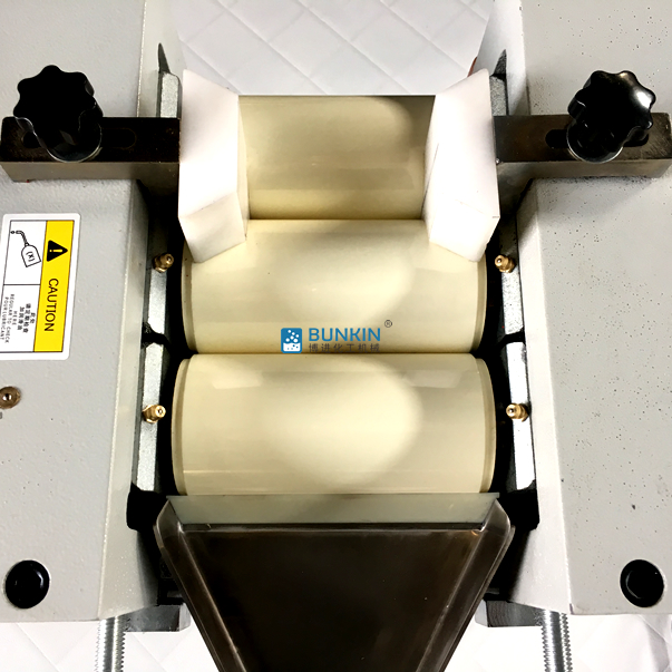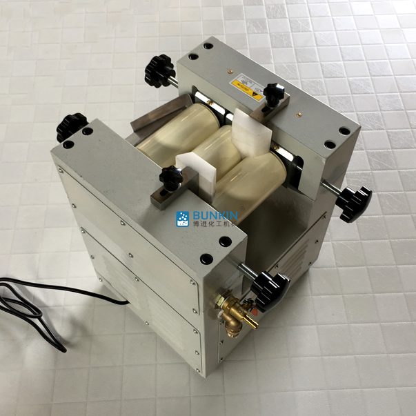 實驗室三輥研磨機適用于需要分散而細度要求較高的膏體或高粘度物料使用;通過水平的三根輥筒的表面相互擠壓,手搖式調節(jié)輥筒之間的間距,以不同速度的摩擦達到研磨效果。裝有緊急制動按鈕,防止落入異物導致的設備損壞。輥子使用特殊硬質合金澆鑄而成,也可以使用純氧化鋯材質。