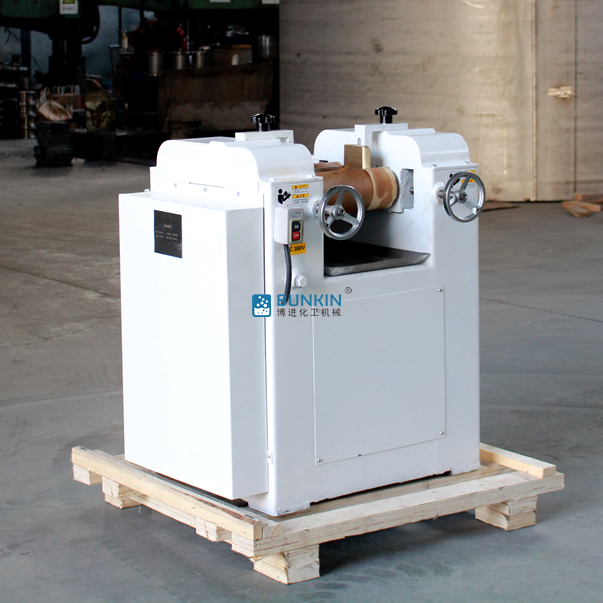 三輥研磨機(jī)由三個(gè)輥筒組成,裝在一個(gè)機(jī)架上,由電動(dòng)機(jī)直接帶動(dòng)。一般輥筒間的轉(zhuǎn)動(dòng)方向不同,前輥向前轉(zhuǎn)動(dòng),中輥向后轉(zhuǎn)動(dòng)。輥?zhàn)愚D(zhuǎn)速前輥快、后輥慢。中間輥固定,前后兩輥裝在滑道上,有彈簧裝置,用手輪調(diào)節(jié)前后輥與中輥的距離。物料由后輥與中輥之間進(jìn)入,受到輥筒的擠壓,產(chǎn)品顆粒變細(xì),然后由快輥帶出,快輥末端裝有刮刀,使物料與輥筒分離,落入收集桶內(nèi)。