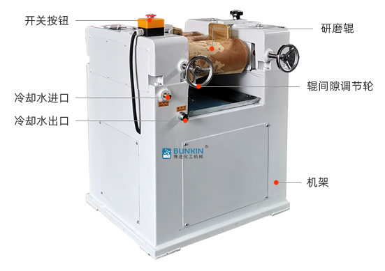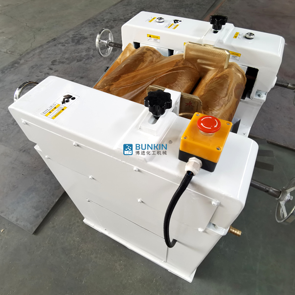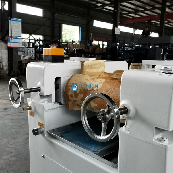 三輥研磨機(jī)由三個(gè)輥筒組成,裝在一個(gè)機(jī)架上,由電動機(jī)直接帶動。一般輥筒間的轉(zhuǎn)動方向不同,前輥向前轉(zhuǎn)動,中輥向后轉(zhuǎn)動。輥?zhàn)愚D(zhuǎn)速前輥快、后輥慢。中間輥固定,前后兩輥裝在滑道上,有彈簧裝置,用手輪調(diào)節(jié)前后輥與中輥的距離。物料由后輥與中輥之間進(jìn)入,受到輥筒的擠壓,產(chǎn)品顆粒變細(xì),然后由快輥帶出,快輥末端裝有刮刀,使物料與輥筒分離,落入收集桶內(nèi)。