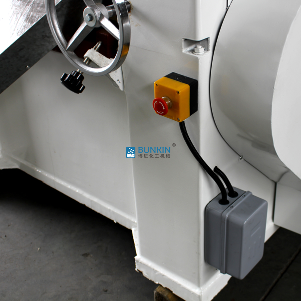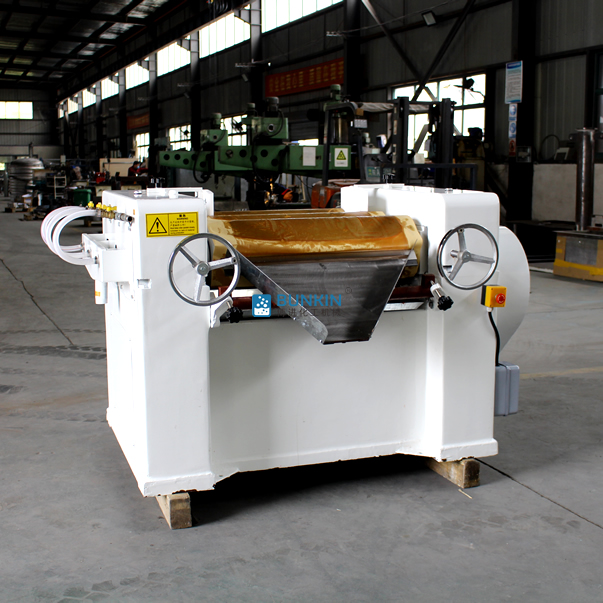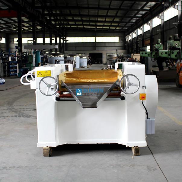 三輥研磨機(jī)由三個(gè)輥筒組成,裝在一個(gè)機(jī)架上,由電動(dòng)機(jī)直接帶動(dòng)。一般輥筒間的轉(zhuǎn)動(dòng)方向不同,前輥向前轉(zhuǎn)動(dòng),中輥向后轉(zhuǎn)動(dòng)。輥?zhàn)愚D(zhuǎn)速前輥快、后輥慢。中間輥固定,前后兩輥裝在滑道上,有彈簧裝置,用手輪調(diào)節(jié)前后輥與中輥的距離。物料由后輥與中輥之間進(jìn)入,受到輥筒的擠壓,產(chǎn)品顆粒變細(xì),然后由快輥帶出,快輥末端裝有刮刀,使物料與輥筒分離,落入收集桶內(nèi)。