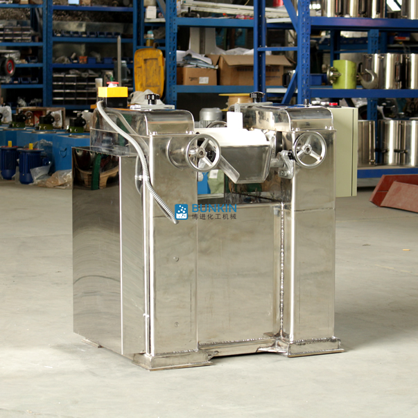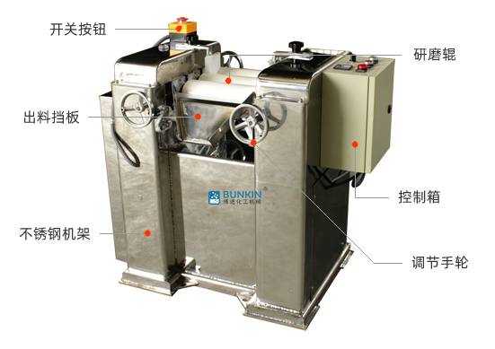 三輥研磨機(jī)由三個(gè)輥筒組成,裝在一個(gè)機(jī)架上,由電動機(jī)直接帶動。一般輥筒間的轉(zhuǎn)動方向不同,前輥向前轉(zhuǎn)動,中輥向后轉(zhuǎn)動。輥?zhàn)愚D(zhuǎn)速前輥快、后輥慢。中間輥固定,前后兩輥裝在滑道上,有彈簧裝置,用手輪調(diào)節(jié)前后輥與中輥的距離。物料由后輥與中輥之間進(jìn)入,受到輥筒的擠壓,產(chǎn)品顆粒變細(xì),然后由快輥帶出,快輥末端裝有刮刀,使物料與輥筒分離,落入收集桶內(nèi)。