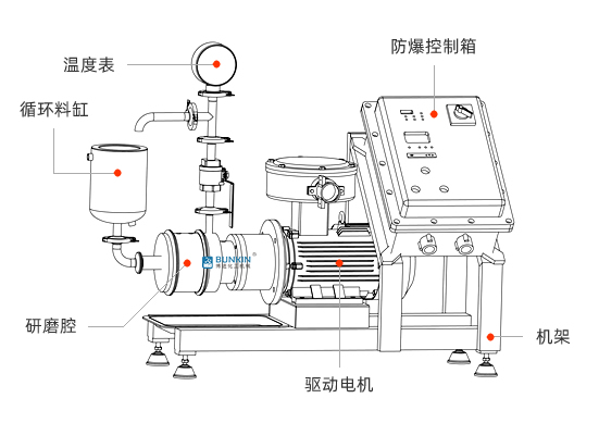 所配料桶及研磨腔體帶冷卻水夾套,在設(shè)備運行時通水冷卻,起到很好的冷卻效果,常規(guī)溫升小于10º。