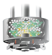 籃式研磨機(jī)工作時(shí)由電機(jī)運(yùn)轉(zhuǎn)帶動(dòng)撥桿和底部分散盤高速旋轉(zhuǎn),使分散盤上部及籃腔內(nèi)部形成真空,漿料被吸入籃式研磨腔內(nèi)。撥桿驅(qū)動(dòng)腔內(nèi)的研磨介質(zhì)產(chǎn)生向各個(gè)方向的力,物料中的顆粒受到介質(zhì)不斷地碰撞及摩擦,粒徑變小,粒徑范圍變窄;分散盤的高速運(yùn)轉(zhuǎn),產(chǎn)生渦流將腔內(nèi)物料抽吸出來,再循環(huán)至進(jìn)料,具有非常顯著的分散研磨混合效果。