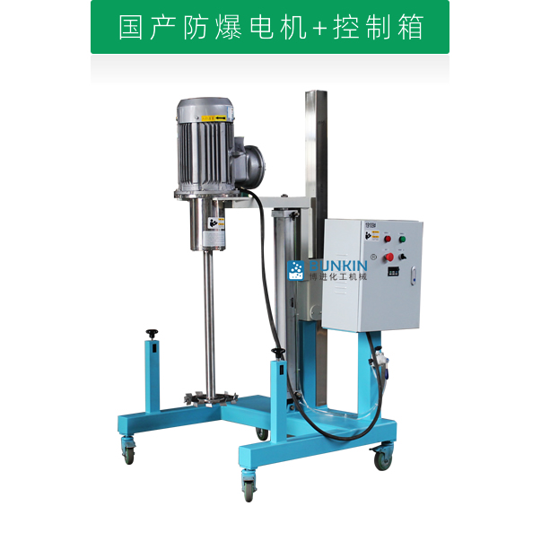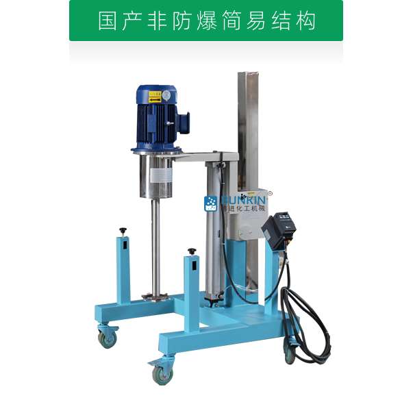 設備通過氣缸作為升降執(zhí)行器,帶氣動控制閥控制分散機上升、停止、下降,耗氣量低,操作簡單;分散盤采用內六角螺栓與主軸固定,能夠方便快速拆卸更換,清洗容易;帶有手動夾桶裝置,可以快速將攪拌桶固定,防止桶在工作中發(fā)生位移造成安全事故;