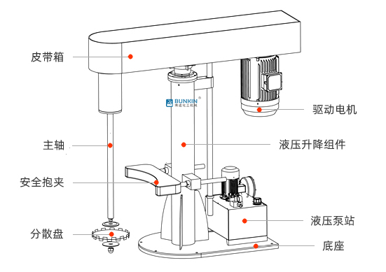 高速分散機通過分散盤的高速運轉(zhuǎn),使物料呈環(huán)狀流,產(chǎn)生強旋渦,呈螺旋狀下降到渦流底部。粒子間產(chǎn)生強烈的剪切撞擊與磨擦,達到迅速分散、溶解、均勻混合、乳化的功能。通過液壓泵工作驅(qū)動液壓柱塞升降,帶動整個傳動機構(gòu)和工作組升降。