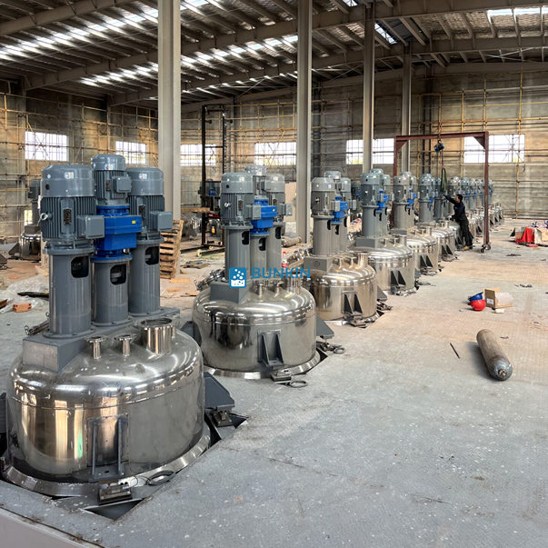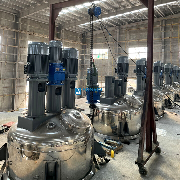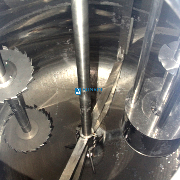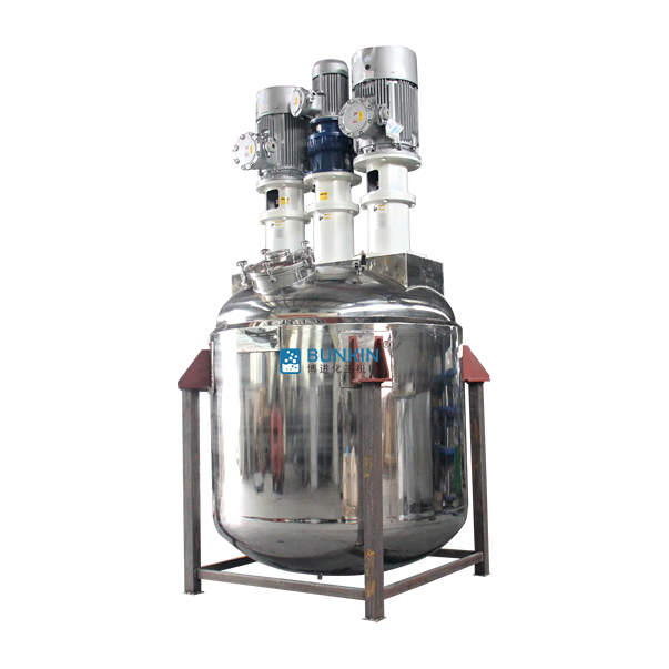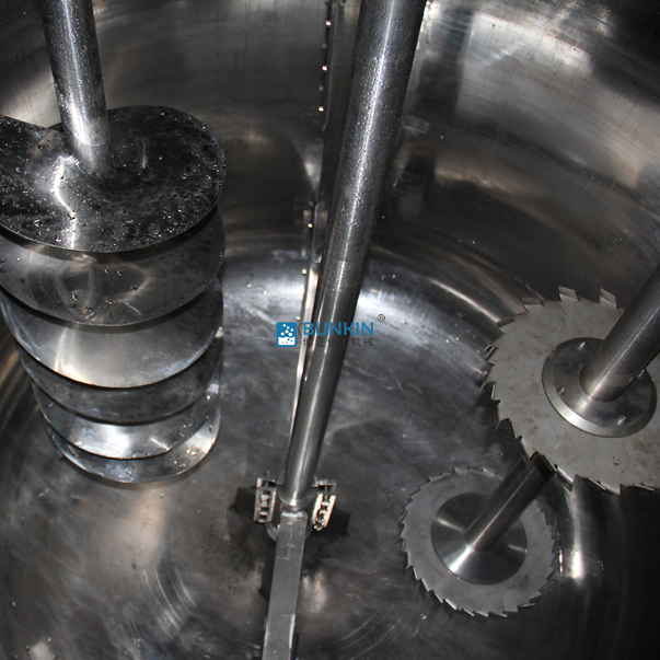 三軸多功能反應(yīng)釜由帶刮壁式攪拌器和高速分散器(乳化頭或研磨頭)組成,三組攪拌器同時作業(yè)使物料受到強(qiáng)烈的分散、混合作用,達(dá)到快速混合的目的;攪拌器一般分為錨式和蝶式兩種,針對不同粘度、比重的物料和不同的生產(chǎn)工藝要求可以設(shè)計較好攪拌形式。