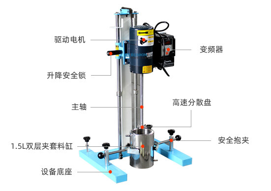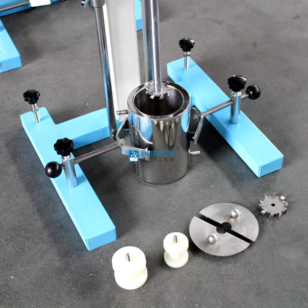 設備帶有鎖緊及升降手柄,能夠快速升降和固定;分散盤采用內六角螺栓與主軸固定,能夠方便快速拆卸更換,清洗容易;帶有夾桶裝置,可以快速將攪拌桶固定,防止桶在工作中發(fā)生位移造成安全事故。