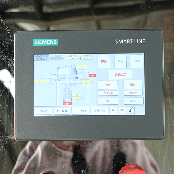 設(shè)備帶有智能化觸摸屏,?具有實(shí)時(shí)監(jiān)控與參數(shù)顯示等功能,支持一鍵啟停、參數(shù)調(diào)整(如開蓋、轉(zhuǎn)速、出料等)